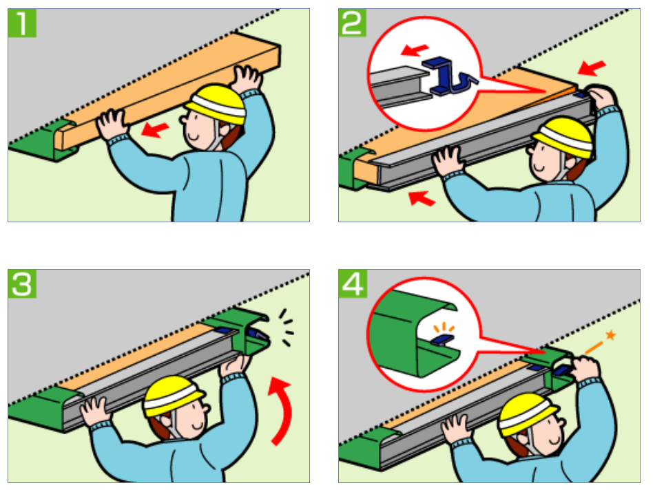 このようにレバーを持ち上げる事により、クリップを固定できます。ビス1本使用しない構造になっており、耐荷重は20kgの実施試験データもあります。
