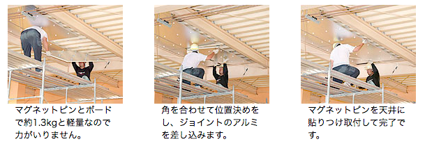 断熱材にマグネットピン金具を取り付けるだけで作業者の手を煩わせません。ビス1本使わないので、短期間で施工が可能です。