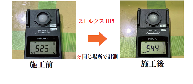 断熱材施工前後で2.1ルクス上昇