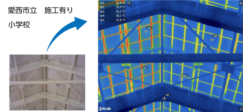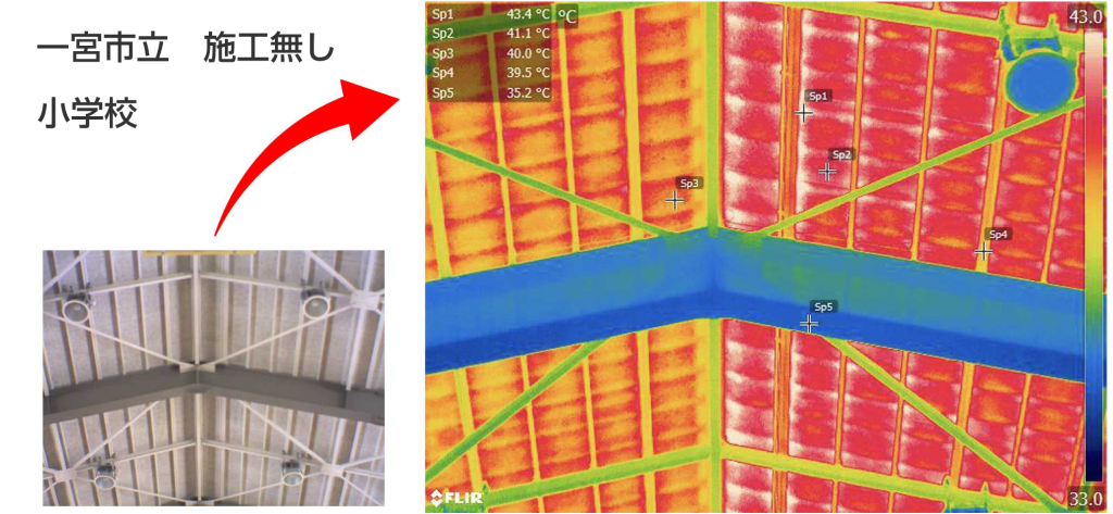 断熱材未施工の部分は60℃以上になっておりますが、施工部分は42℃まで下がりました。